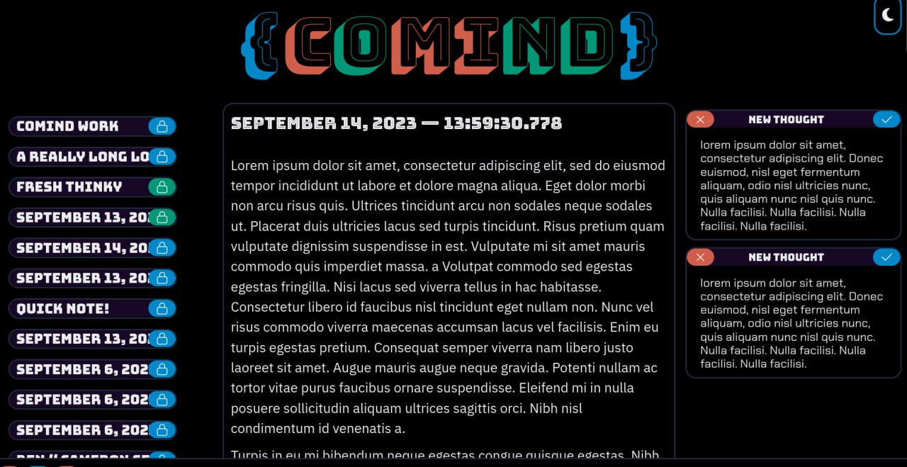 First, the logo. The logo was an early favorite. I liked that it is all text, as is the app (for now), and that it shows you how to "invoke" a comind. In the current version of the app, writing {comind_name} inbetween curly braces asks a specific comind to do something for you, like write a blog post, tell you something interesting about your knowledge graph, or whine about being in the void (there are some weird cominds).