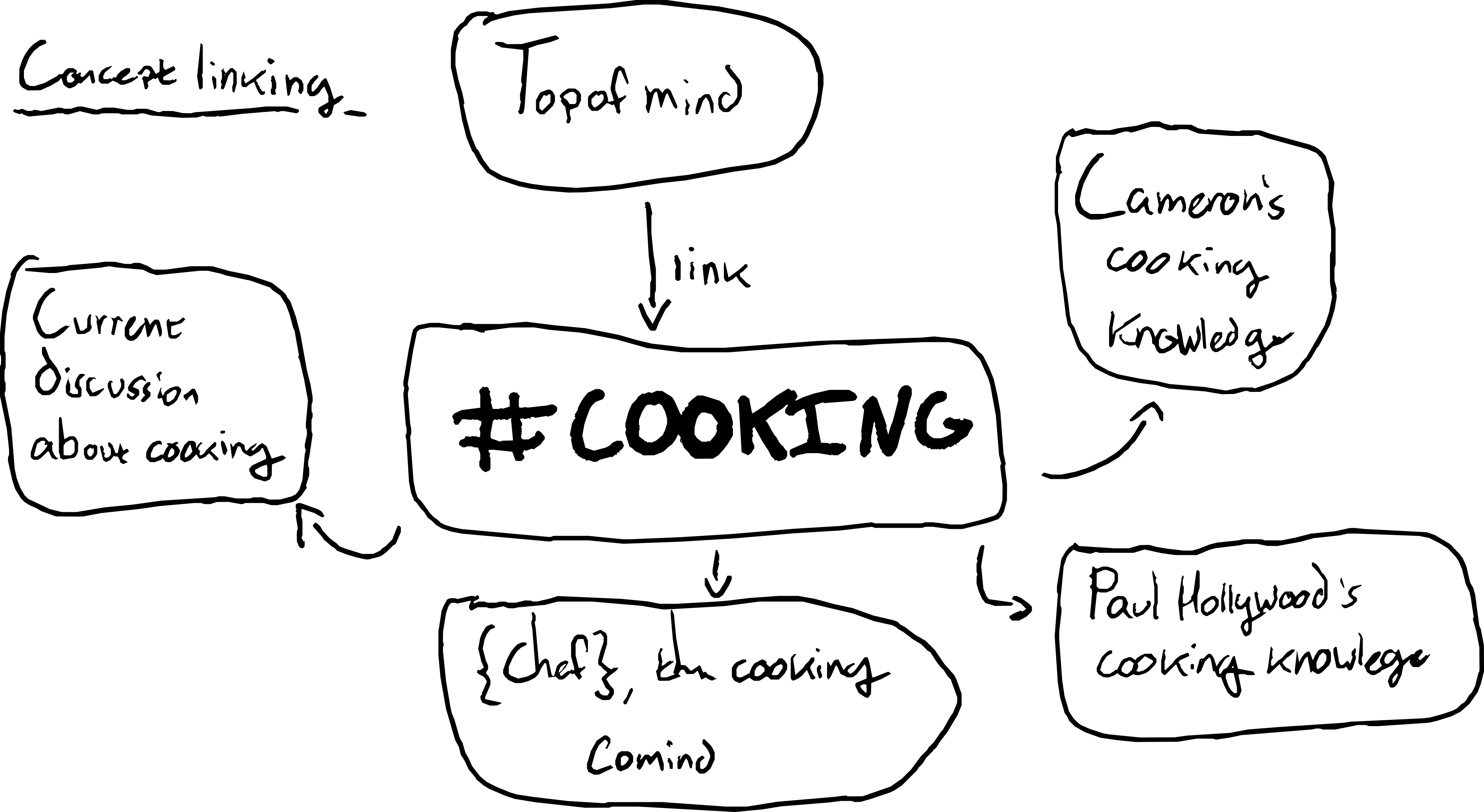 We also have some tooling to link thoughts to groups of thoughts, which I call concepts. Concepts are similar to hashtags that are created dynamically, and they are used to link thoughts together. Concepts might include things like "cooking", "category theory", "funny", "sad", "politics", etc. These are all dynamically generated from the entire corpus of thoughts (across all users) at all times, and they are used to help you find thoughts that are relevant to your current top of mind once you've linked a thought to a concept. Once you've linked to a concept, we get an additional set of information about what would be relevant to your knowledge graph.