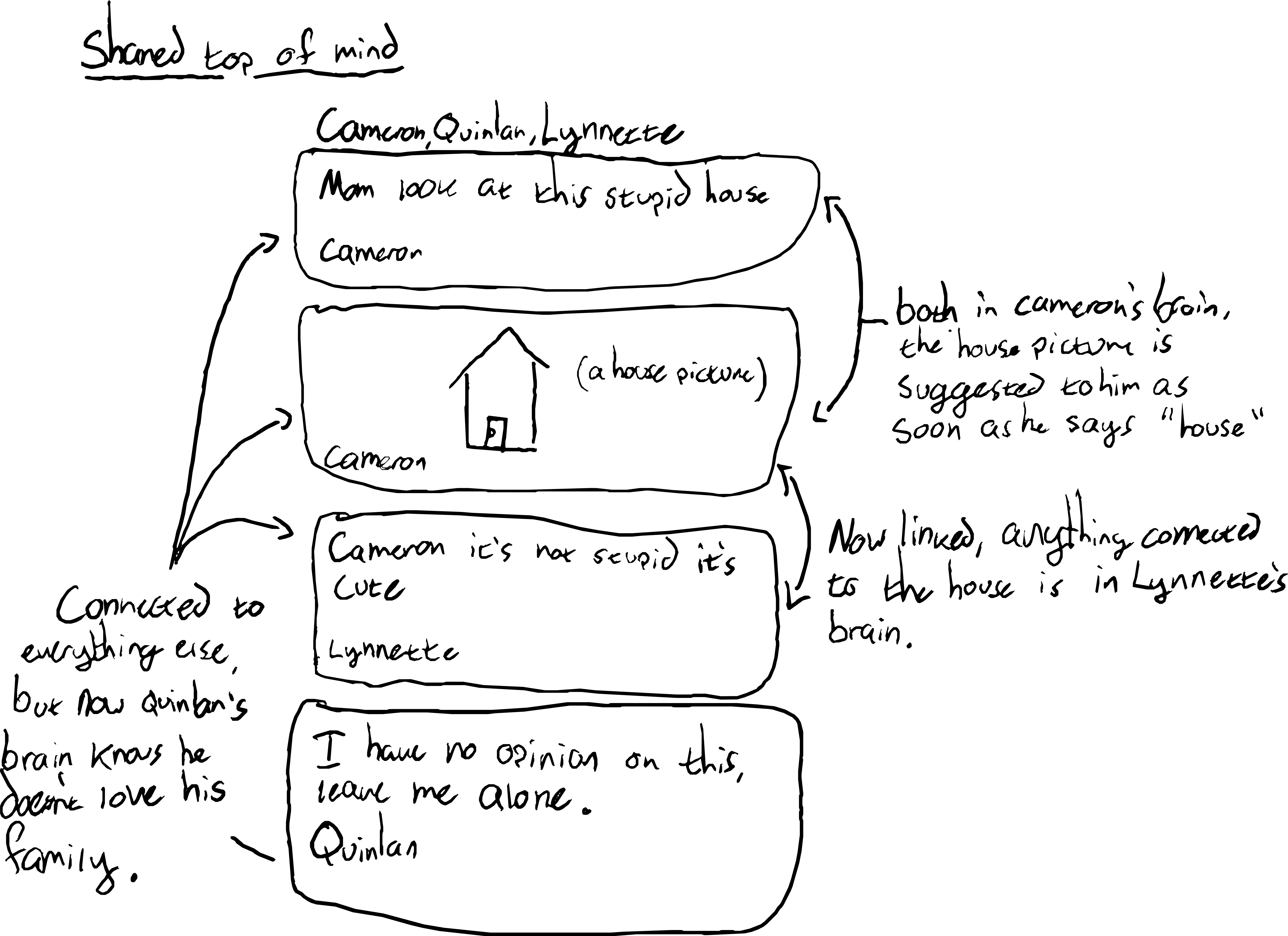 Mom and Q can then respond to my thoughts, and we can have a conversation about the stupid house. Mom loves the house, so now the knowledge graph knows that mom has preferences for houses with a certain style. Quinlan opts out of the discussion so now the knowledge graph knows that he doesn't love his family.