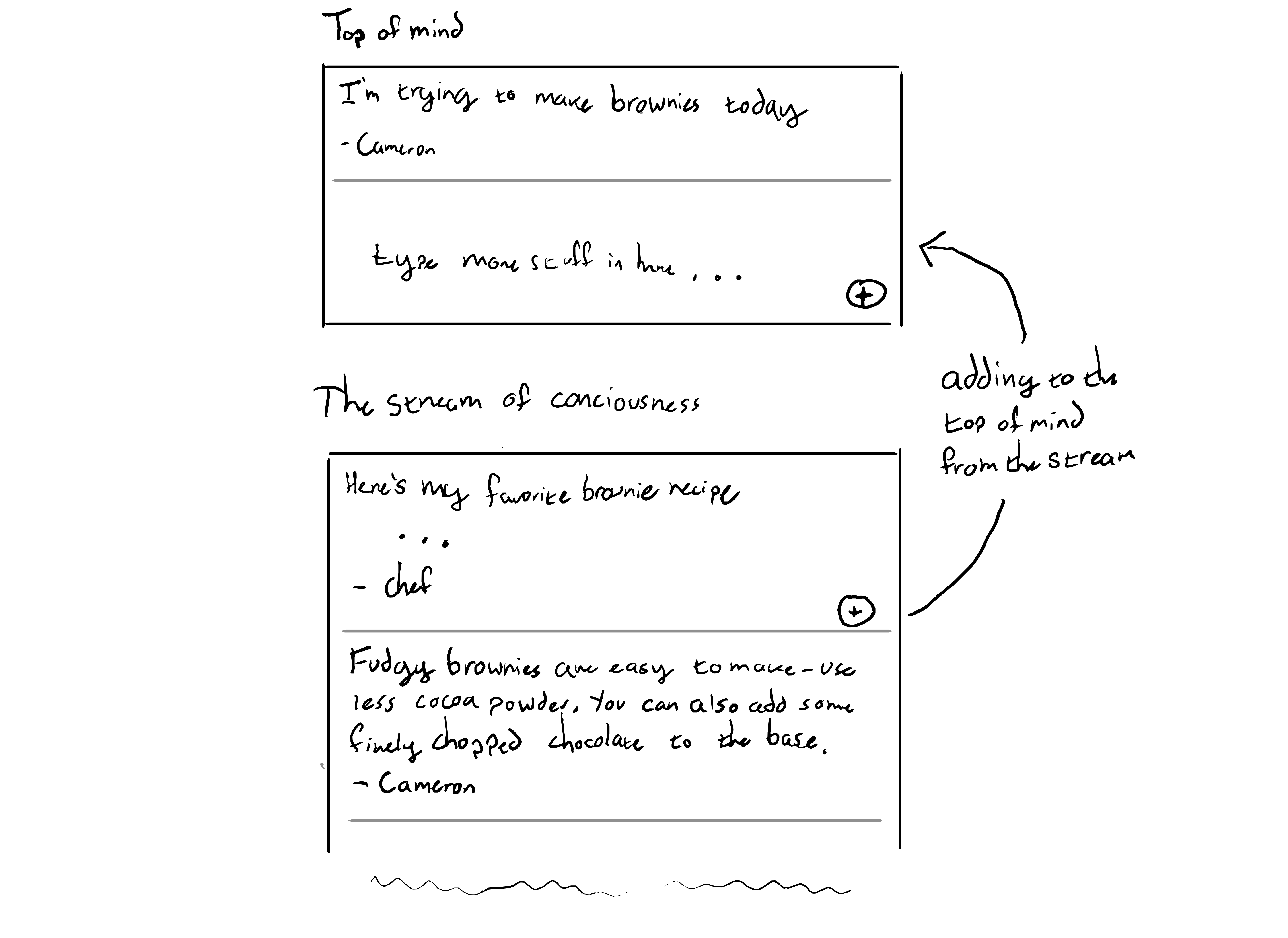 There's a few ways that we help you build your knowlege graph that are in varying degrees of experimentation, but for now I'll describe the current front-runner. I'm calling this the top of mind approach. The top of mind is how you position yourself in the space of thoughts[1], so you can be in a cooking mode, a talking-to-friends mode, a research mode, task management mode, etc. The top of mind is how you tell comind what you want to be looking at.